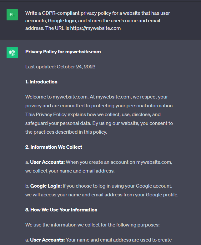 ChatGPT (even the 3.5 version) is also great for generating customized legal texts like privacy policies and terms for your apps. In the past, we had to use cumbersome and expensive online generators for that. Now you can just tell ChatGPT what data you're collecting and what services you're using, and ask it to write a legal text. For example: "Write a GDPR-compliant privacy policy for a website that has user accounts, Google login, and stores the user's name and email address. The URL is https://mywebsite.com".