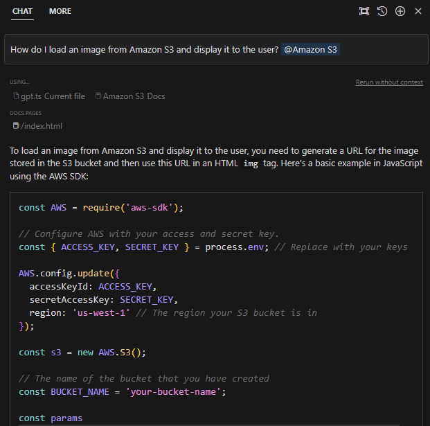 Cursor is a fork of VS Code with an even tighter ChatGPT integration. While GitHub Copilot is trained on open-source code, Cursor can also index and search through documentation. When you have a question about, let's say, Amazon S3, you can tell it to search through the Amazon S3 documentation and answer your question based on it. It can crawl and index any documentation web page you want.