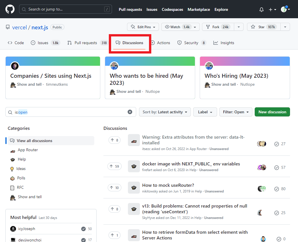 Another place that's very accepting of more casual questions is the Discussions tab on the GitHub page of the framework or package you have a question about. Here is the one for Next.js, for example.