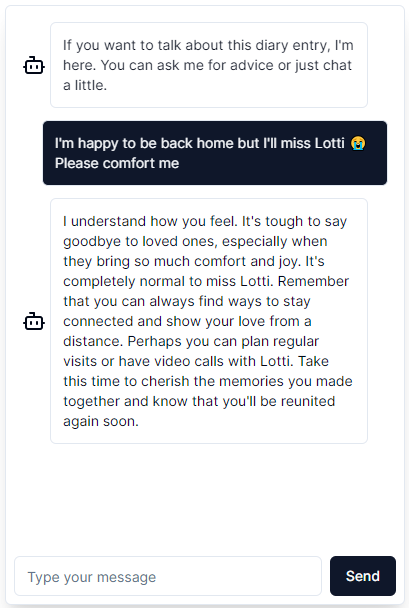 In Smart Diary, I use ChatGPT to generate diary entries from notes and to summarize entries you submitted so you can read them at a glance. I also built a chatbot with which you can talk about your past entries:
